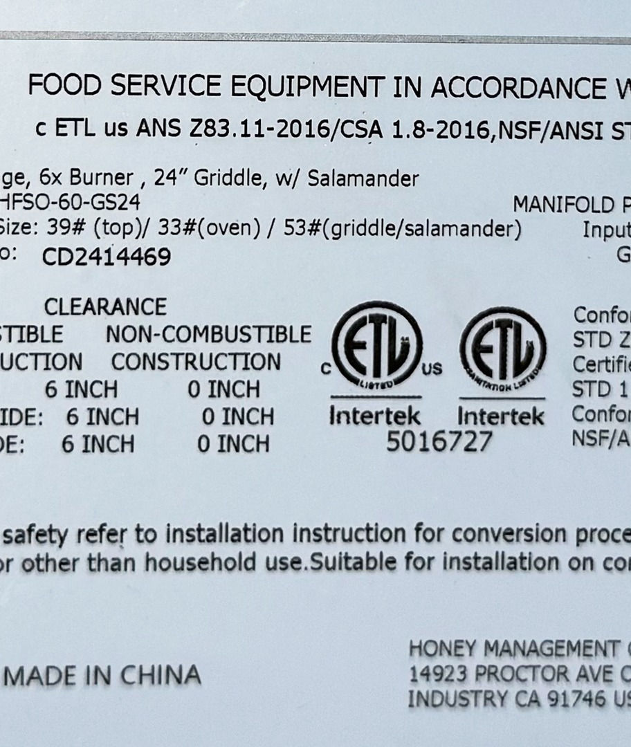 60 ins 6b24g cheese melter NSF oven range STGCD-HFSO-60-GS24
